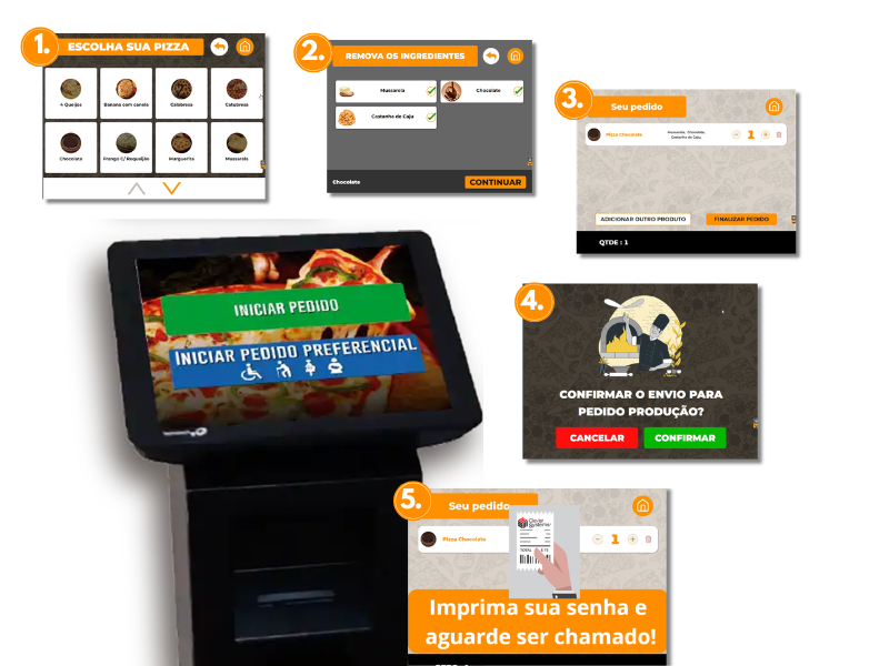 Exatamente. O cliente realiza todo o pedido de forma autônoma — escolhe sabores, adicionais e finaliza o pagamento diretamente no totem. Isso agiliza o atendimento, reduz filas e contribui para o aumento do ticket médio da pizzaria.