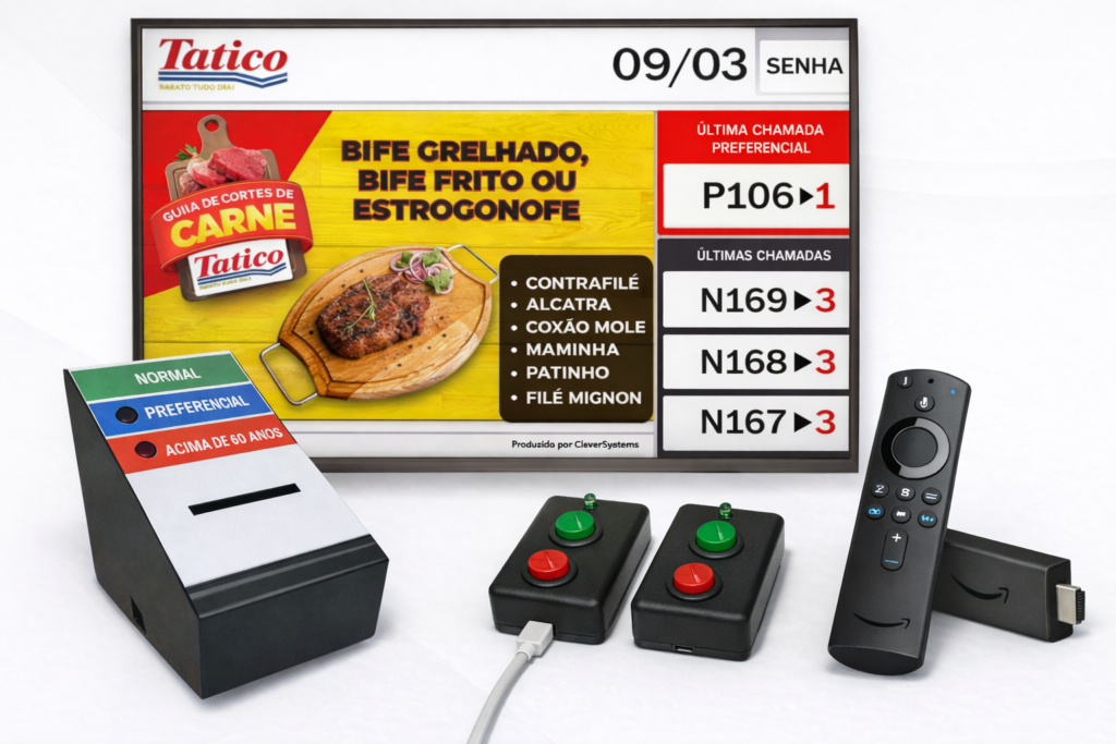 Organize o fluxo de atendimento do seu açougue de forma profissional, evitando filas desordenadas e melhorando a experiência do cliente desde a chegada até o momento do atendimento. O sistema de senhas permite que cada cliente aguarde sua vez com conforto e de acordo com sua prioridade, acompanhando a chamada de forma clara em uma TV com mídia indoor e com aviso automático no áudio da loja. Dessa forma, o cliente pode continuar realizando suas compras enquanto aguarda a chamada de sua senha.